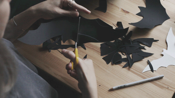 After your two sized bat templates are ready (you can make as much of them as you want), with a light colored pen trace your templates on black paper so you can fit as much of the bats as possible.
